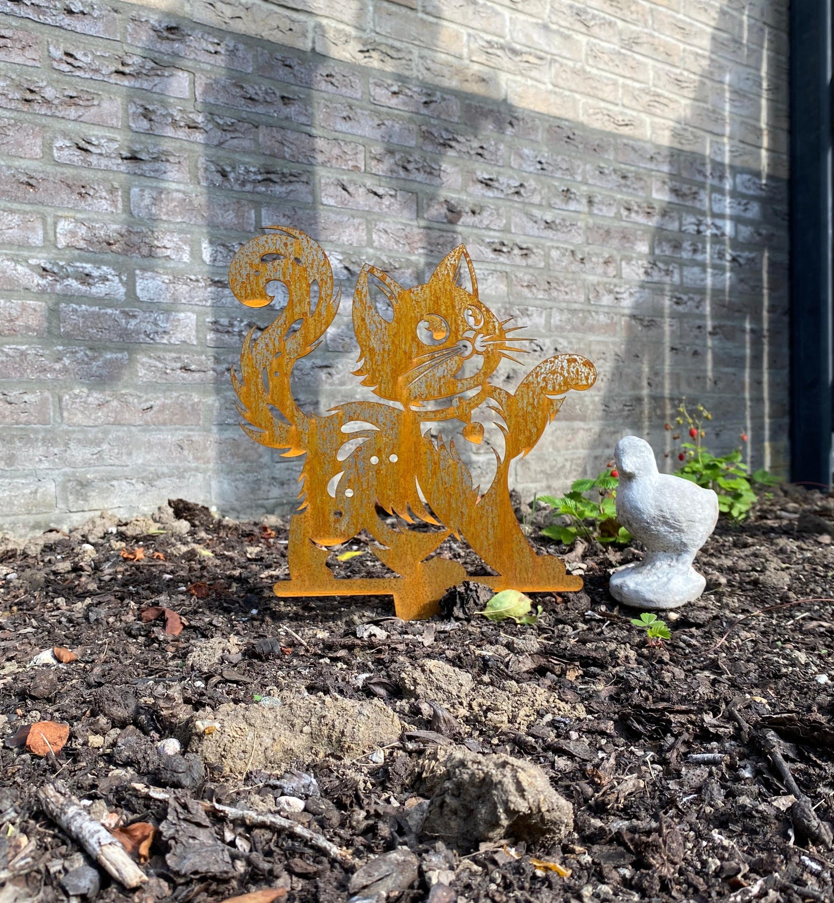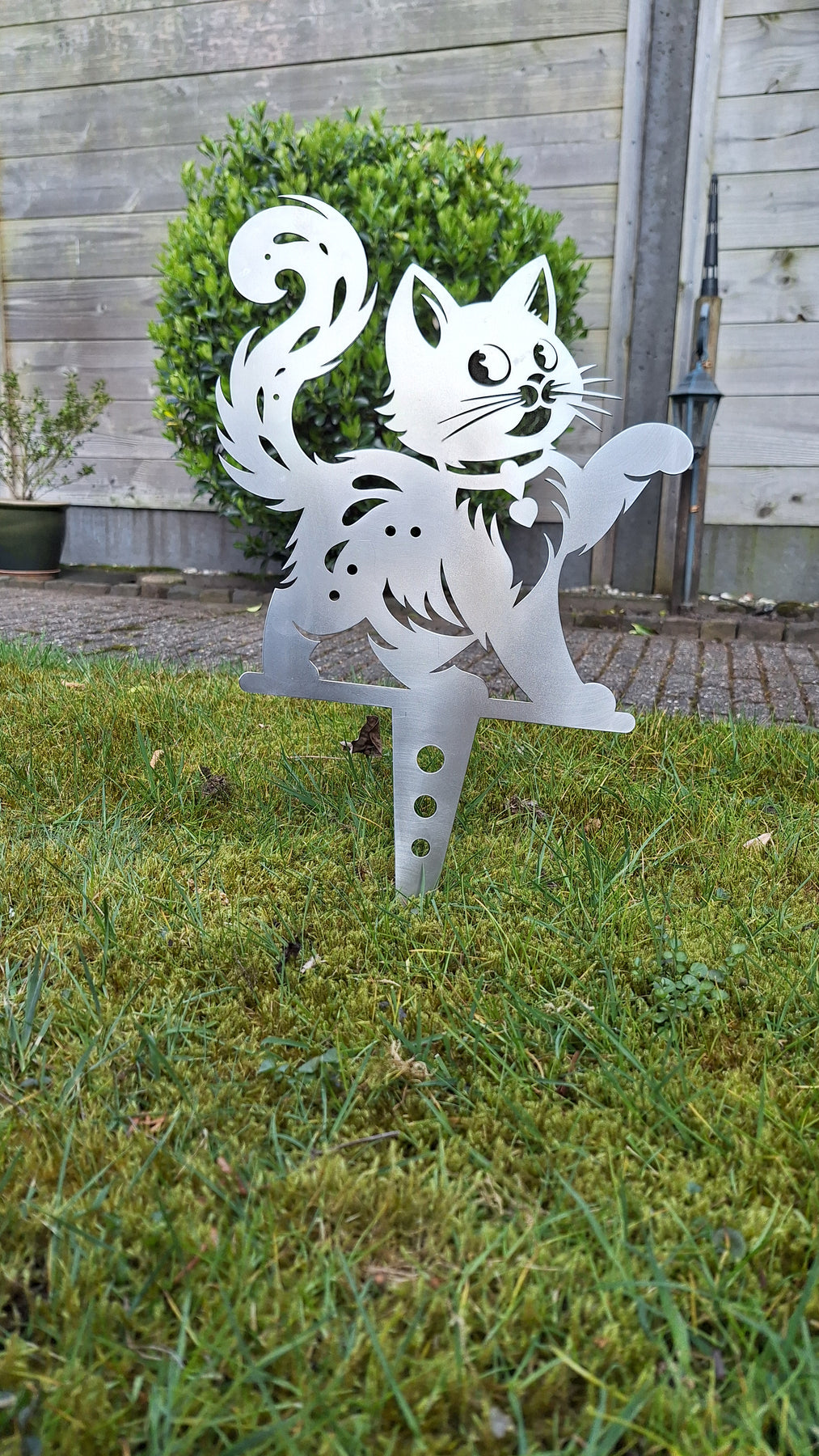 Bringen Sie mit Fliefje, der Katze , einem charmanten und verspielten Gartenstecker aus Cortenstahl, einen Hauch von Liebe und Freude in Ihren Garten. Fliefje läuft stolz mit einem Herz am Halsband herum und ist bereit, jeden Garten mit ihrer warmen Präsenz zu verschönern.